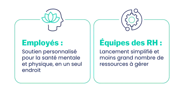 - Les employés obtiennent un soutien personnalisé au mieux-être qui leur convient, en combinant la santé mentale et physique en un seul et même endroit, sans devoir passer d’une solution à l’autre. Ce soutien les aide à adopter de petites habitudes significatives pour mieux se sentir au quotidien.